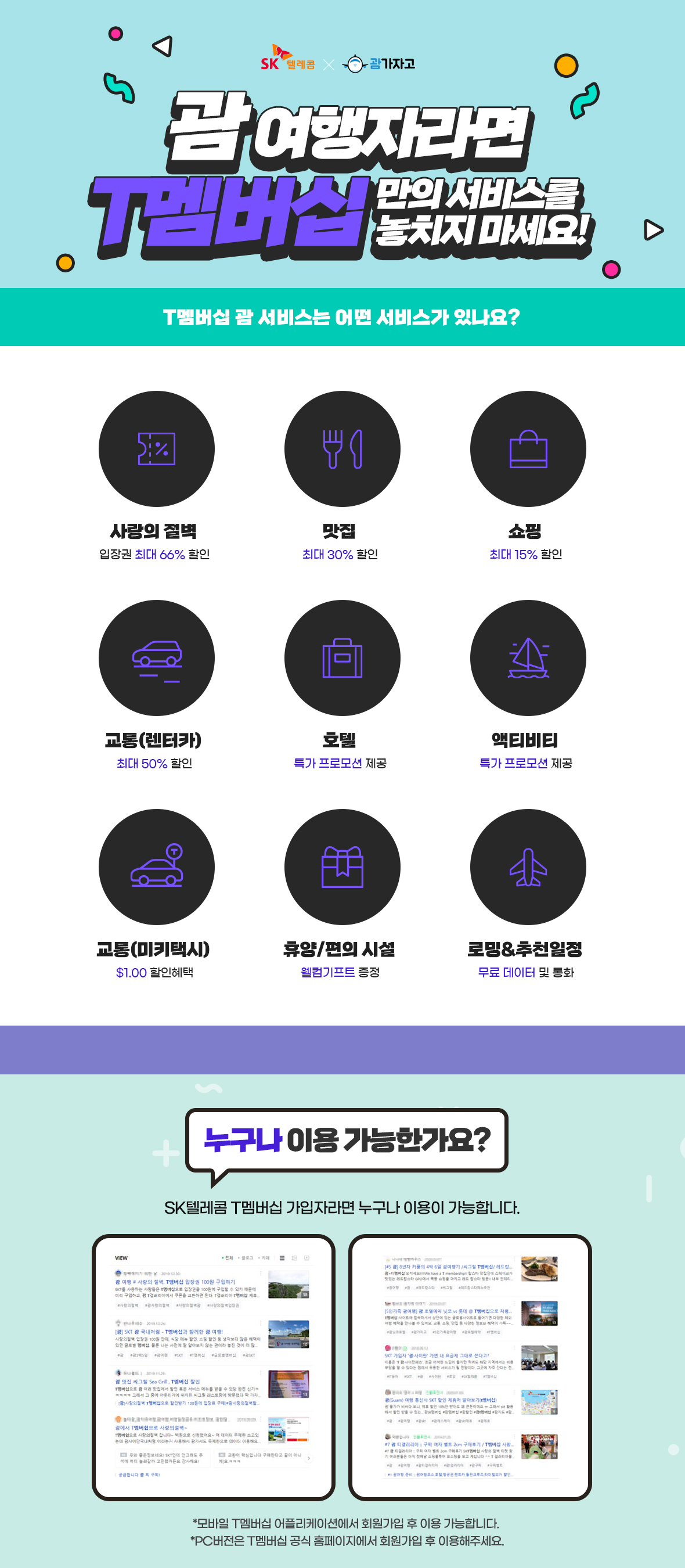 게다가 호텔, 렌터카도 상시 할인 중이니까 가심비 있는 괌 여행은 T 멤버십에서 쌉가능!